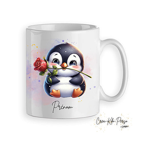 Mug tasse Pingouin mignon mignon avec une rose rouge, cadeau personnalisé prénom.
