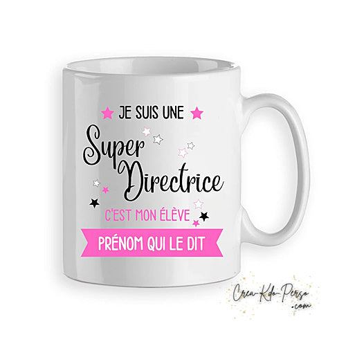 Mug tasse cadeau pour Directrice Directeur enseignant, modèle super Directrice c'est mon élève qui le dit, version homme ou femme personnalisé avec un prénom ou pseudo.