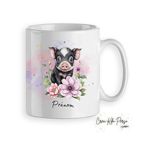 Mug tasse modèle cochon noir et rose mignon décoration florale personnalisable prénom ,cadeau enfant, adulte.