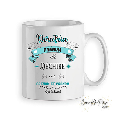 Mug tasse cadeau humour pour Directeur Directrice , modèle Directeur Directrice qui déchire. Version homme ou femme personnalisé avec un prénom de directeur directrice et prénom de d'élève.