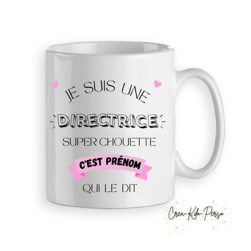 Mug tasse cadeau pour Directrice Directeur enseignant, modèle je suis Directrice Directeur super chouette c'est mon élève qui le dit, version homme ou femme personnalisé avec un prénom ou pseudo.
