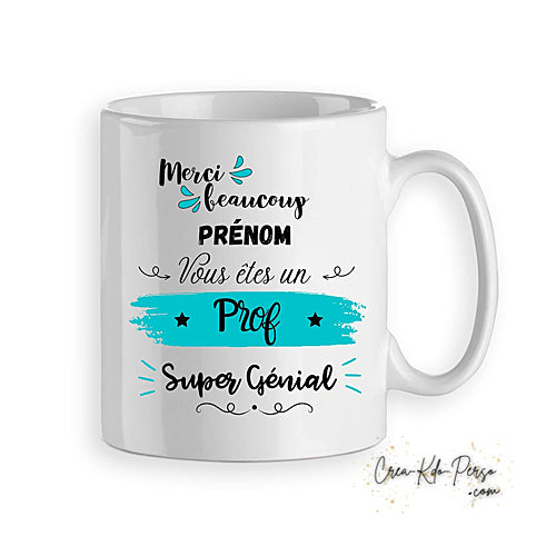 Mug tasse cadeau modèle merci prof professeur trop génial version homme ou femme personnalisé avec un prénom.