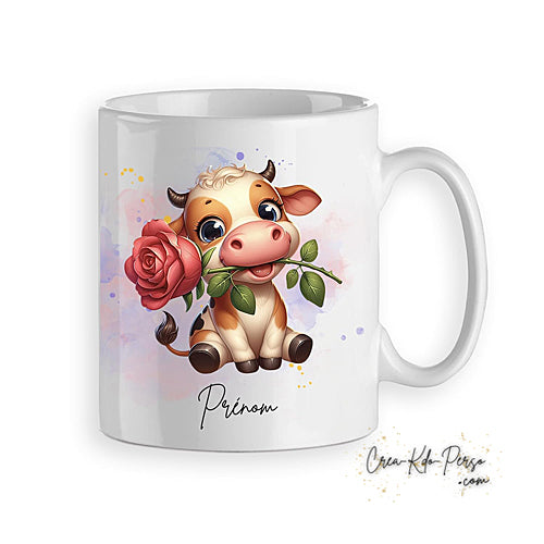 Mug tasse cadeau pour enfant ou adulte, modèle vache marron et blanche mignonne avec fleur dans la bouche personnalisable prénom.