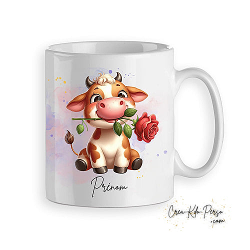 Mug tasse modèle vache marron et blanche rigolote avec fleur dans la bouche personnalisable prénom ,cadeau enfant, adulte.